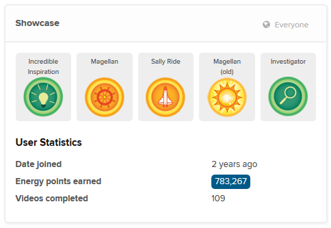 Energy Points is an incentive on Khan Academy, given for completing skills, completing programming challenges, earningbadges, watching videos, participating in discussions and a variety of other tasks. Before Khan Academy's new layout in 2012, the number of Energy Points that a user currently had were invisible at any page in Khan Academy. With the new profile page, users can hover over someone's name on comments and programs or go to a user's profile to see their total Energy Points.